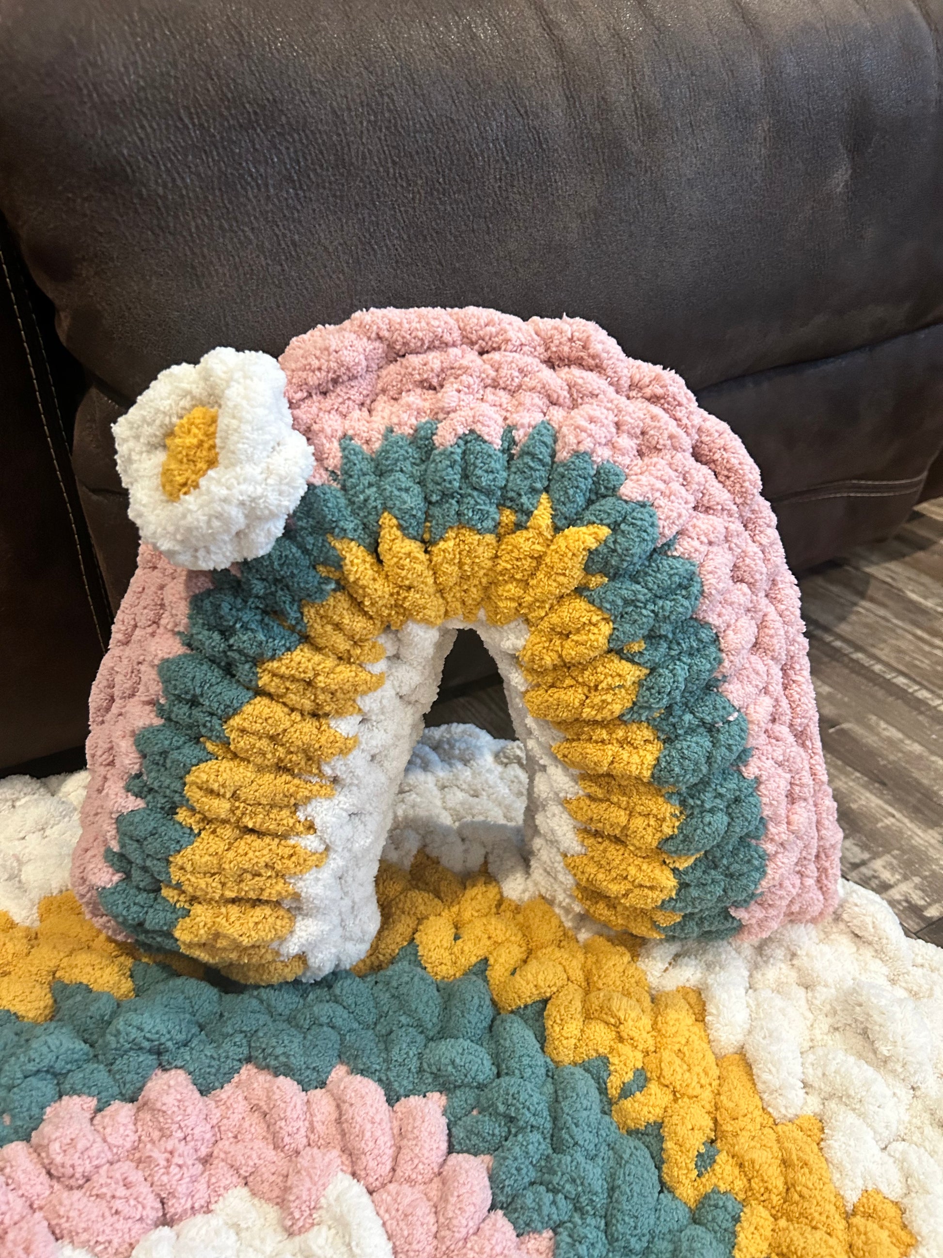 This is a perfect baby shower gift for the loved ones in your life. Great for tummy time or just to lay baby down on. Comes with a matching rainbow pillow. These play mats are HAND CROCHET (not hand knitted. Which means this mat is much thicker than our other play mats and blankets. The finished baby playmat will measure approximately 30 x 30'' and nearly 2' thick. The finished rainbow pillow will measure approximately 12x12''.