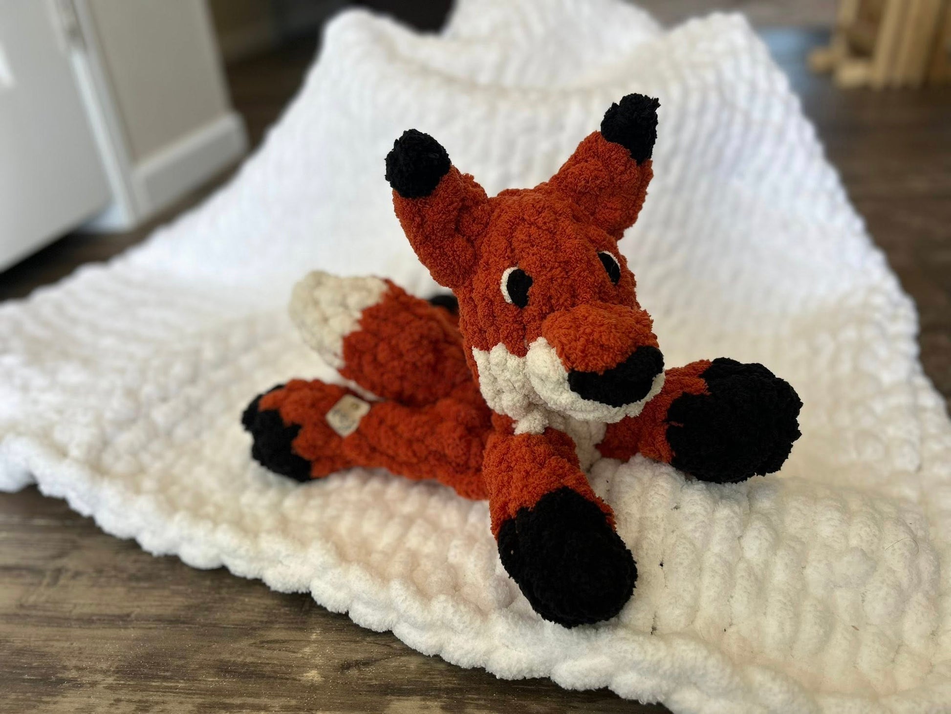This cozy hand knit fox is a perfect stuffed animal for a little one, works well for decor, and make a great gift for Christmas, baby showers, etc. He's made with 100% polyester yarn; its head is stuffed with Poly-fil. With embroidered eyes for safety, they make a great companion for all ages. The minis are approximately 16in long and the large size is approximately 22in long.