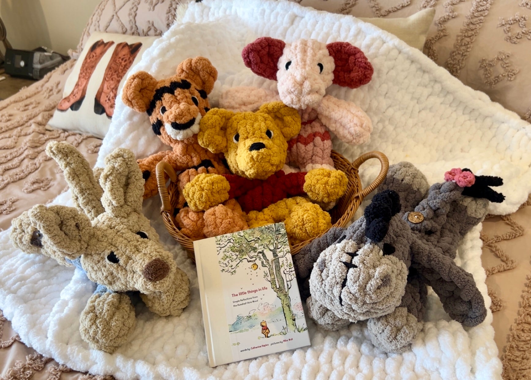 Crafted with soft, 100% polyester chunky yarn, Pooh and all his friends are perfect for cuddling and comfort. Their heads are filled with plush poly-fil, giving them a huggable, squeezable feel. Their embroidered eyes ensure safety, making them a perfect companion for all ages.